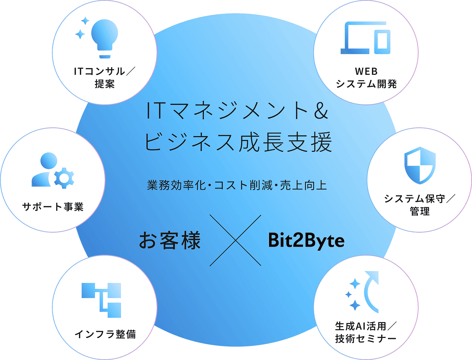 私たちは、お客様のビジネス成長を支える「ITパートナー」として、業務効率化・コスト削減・売上向上を実現するため、最適なソリューションを提案し、確かな技術力で支援します。システムの導入から運用まで一貫したサポートを行い、お客様のDX推進を加速します。ITの力で未来を創る、それが私たちの使命です。