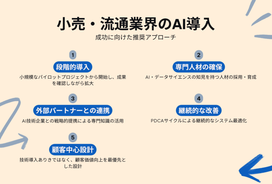 小売・流通業界でのAI導入を成功させるためには、以下のアプローチが効果的です: