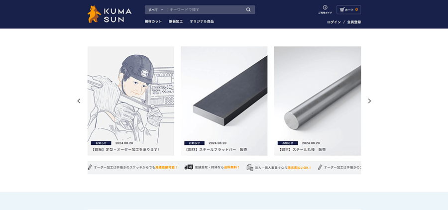 株式会社熊乃前鋼材様よりご依頼をいただき、業界特有の仕様に対応したECサイトをShopifyで構築しました。寸法や材質の組み合わせ販売など、Shopifyの標準機能だけでは実現が難しい要件に対応しました。