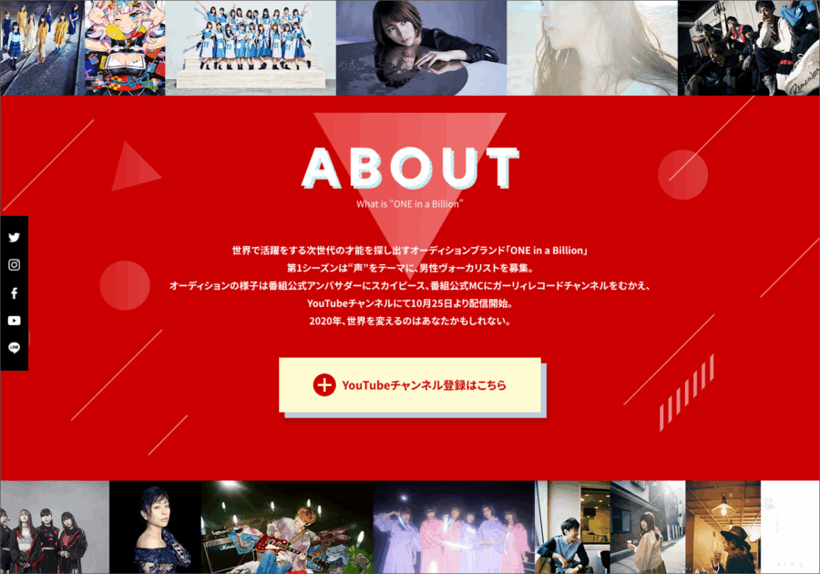We have built a website “One in a Billion,” including designing a logo, and a flyer. The purpose of this website is to find the next talent by auditioning, as well to collaborate with various talents by Sony Music Entertainment. To find the worldwide remarkable talent for the next generation, we schedule to find the talent after a half year of selection process in order for everyone to enjoy the auditioning process.